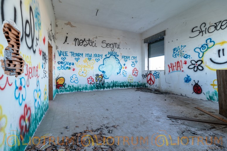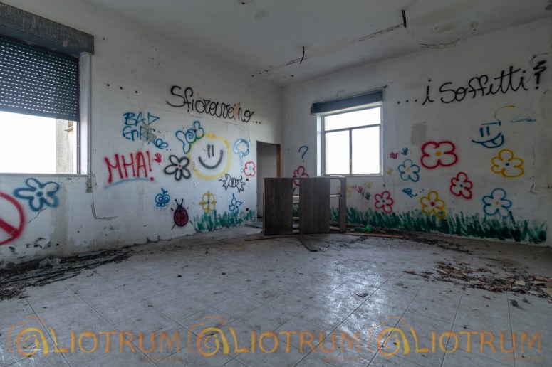 Dalle poche informazioni che siamo riusciti a reperire, questo edificio abbandonato fu adibito prima a orfanotrofio, poi a scuola e in ultimo utilizzato da una comunità cattolica impegnata nell’accoglienza. La costruzione ricopre una vasta superficie, si possono evidenziare le stanze un tempo adibite a sale studio o svago per i bambini ospiti. Altre stanze immaginiamo siano state utilizzate come cucine e altre come dormitori. Infine troviamo annessa una cappella il tutto condito da tanta immondizia.