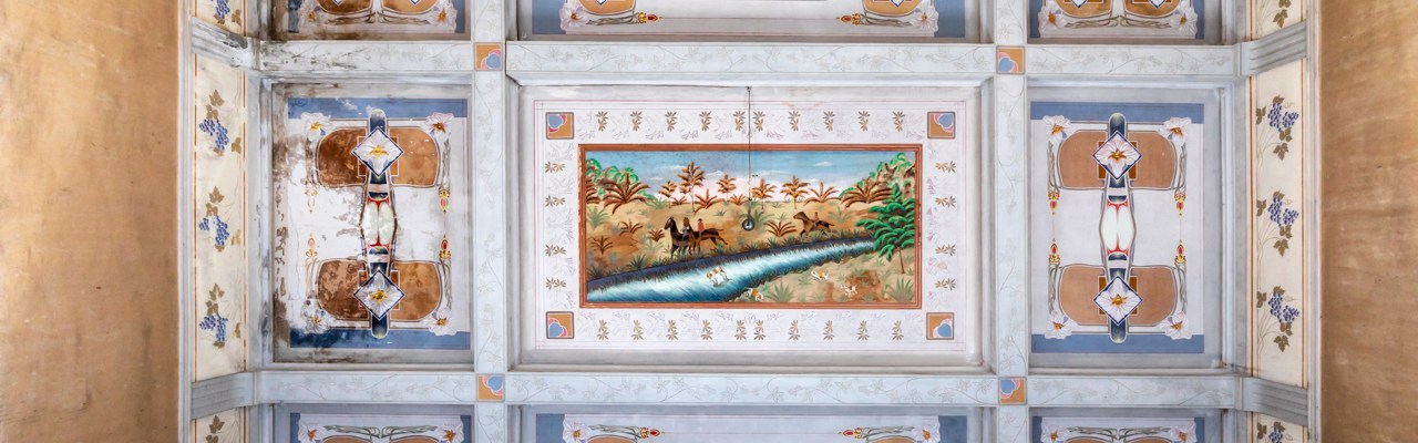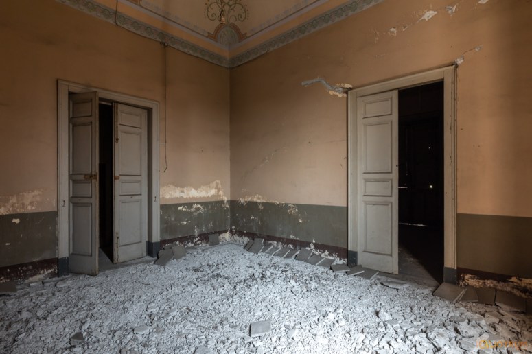 Big, wonderful and abandoned. it is pitch dark, we enter, we open a window and a glimmer of light illuminates the treasure that this villa hides. All the ceilings of the rooms are adorned with frescos in liberty style, the almost completely absent floors and the now decadent noble vestiges. Joined to the villa we find a warehouse also containing a treasure: many large wooden barrels destroyed and unusable arranged in a row.