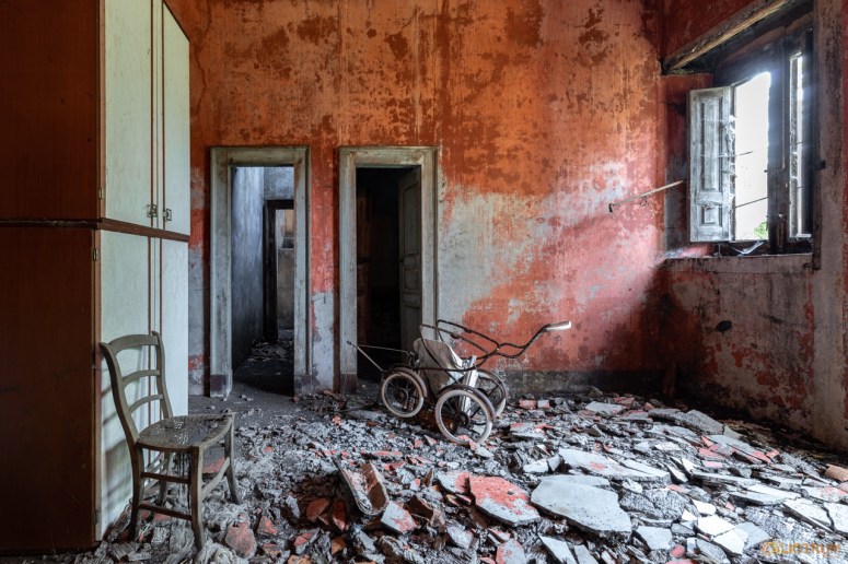 Lo scheletro di un passeggino raffigura, perfettamente, le condizioni di questa casa dimenticata.