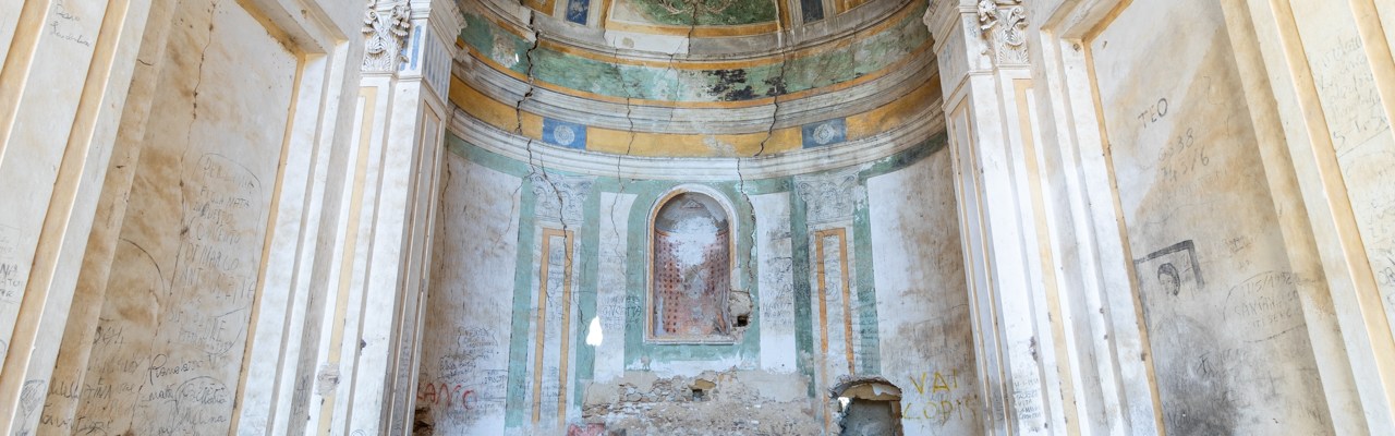 La cappella è quasi del tutto crollata e il cortile interno è ridotto un ammasso di macerie, quasi come se l’eremo fosse stato vittima di un bombardamento. Un odioso tanfo stallatico nell’aria ci fa capire che camminando, oltre ai cocci di muro crepato per terra, dovevamo stare attenti anche a non calpestare dell’altro, decisamente meno gradevole.