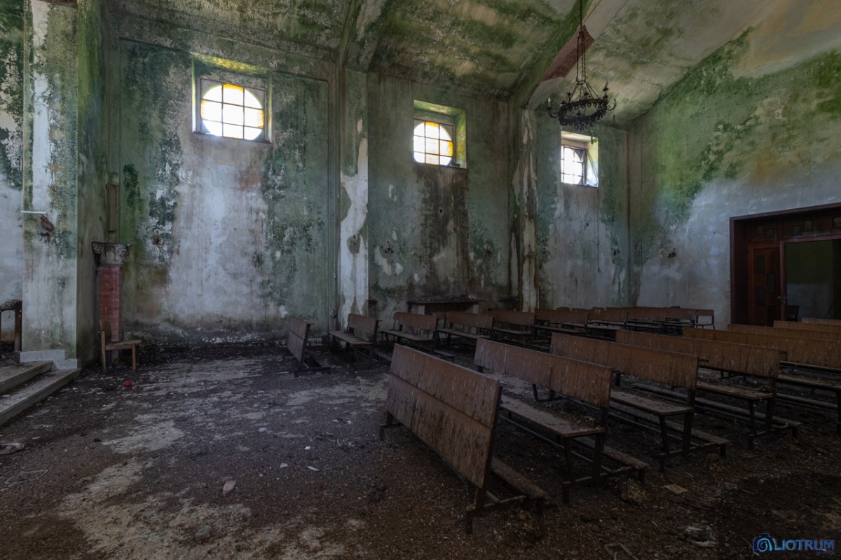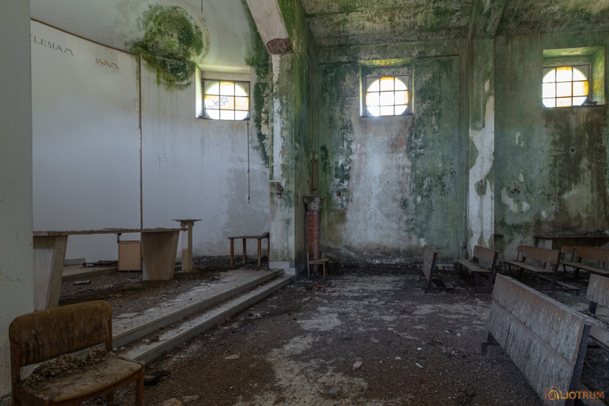 La troviamo sbarrata e impenetrabile, con all’interno panche e altare, i muri ricoperti di vegetazione e l’immancabile guano dei piccioni.