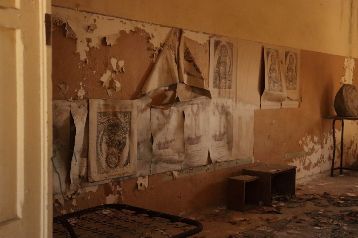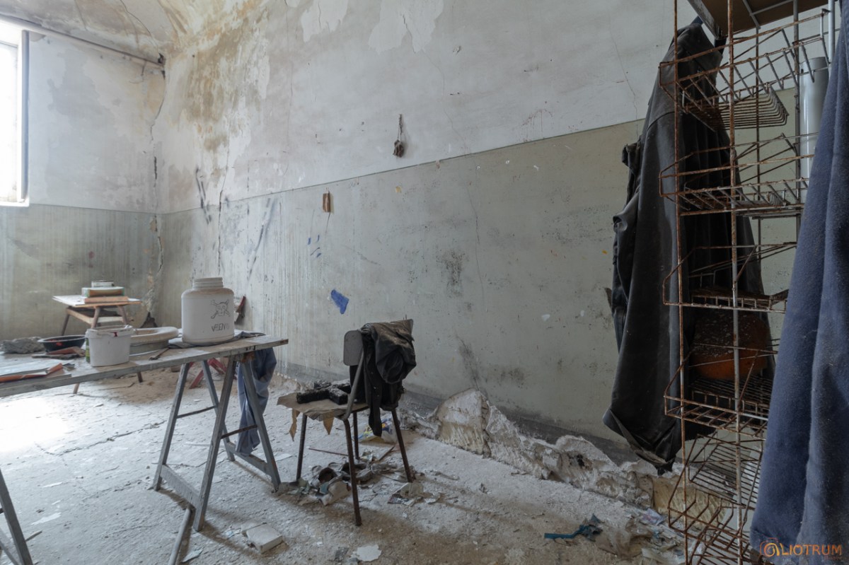 Nel lato opposto, dove ci sono le aule quasi vuote e mal ridotte, troviamo alcune attrezzature. Vedendole ho avuto l’impressione che siano state usate recentemente, infatti troviamo una tela dipinta e dei pennelli.