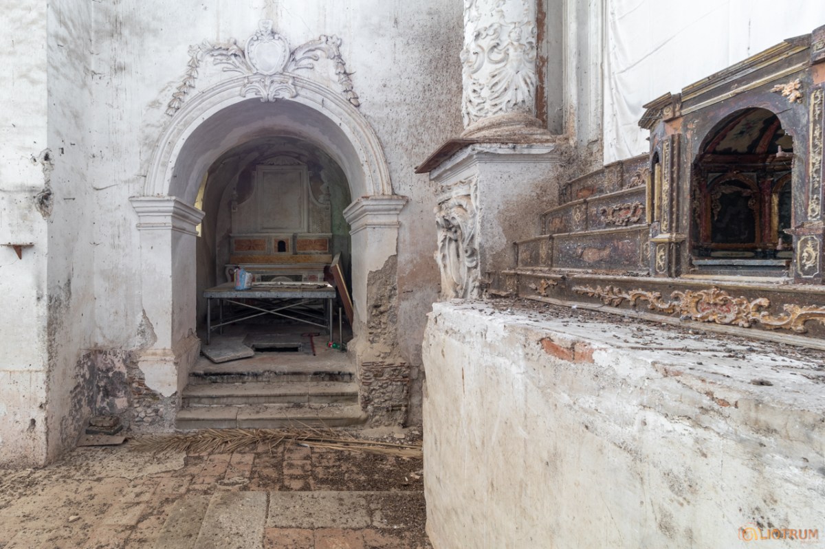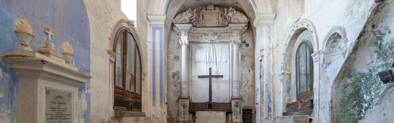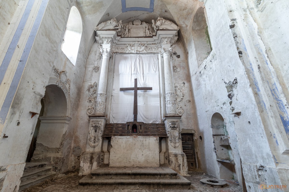 Nella chiesa vuota, solo una semplice croce fa la guardia a edifici che nessuno abita più.