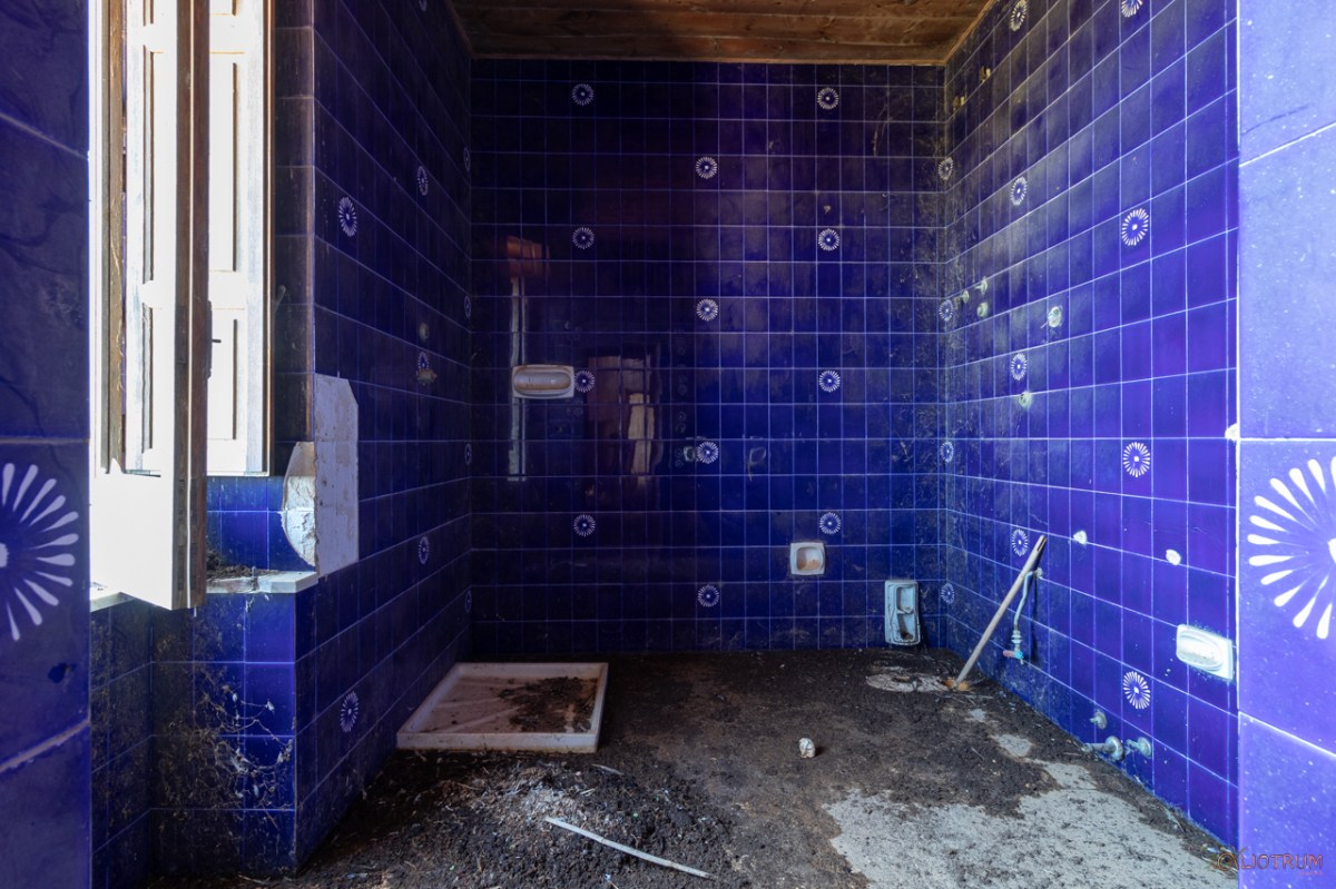 Zona magazzini al piano inferiore, zona “nobile” a quello superiore. Mattonelle di dubbio gusto ancora resistono lungo le pareti dei servizi igienici depredati da qual si voglia arredo. Solo stanze vuote colme di silenzio e escrementi di vario genere.